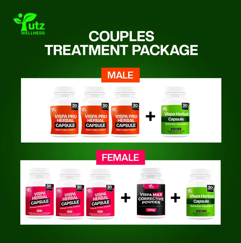 Now, the ultimate treatment package, which we like to call couples package, includes 3 Bottles of Vispa Herbal for Female Fertility Solution and then 3 Bottles of Vispa Herbal for Male Fertility Solution, and one bottle each of the Infection Capsule and Correction Powder.